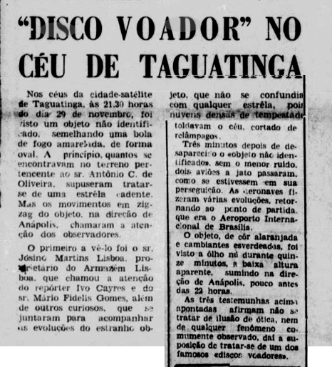 Nos céus da cidade-satélite de Taguatinga, às 21.30 horas do dia 29 de novembro, foi visto um objeto não identificado, semelhando uma bola de fogo amarelada, de forma oval. A princípio, quantos se encontravam no terreno pertencente ao sr. Antônio C. de Oliveira, supuseram tratar-se de uma estrela cadente. Mas os movimentos em zig-zag do objeto, na direção de Anápolis, chamaram a atenção dos observadores.
